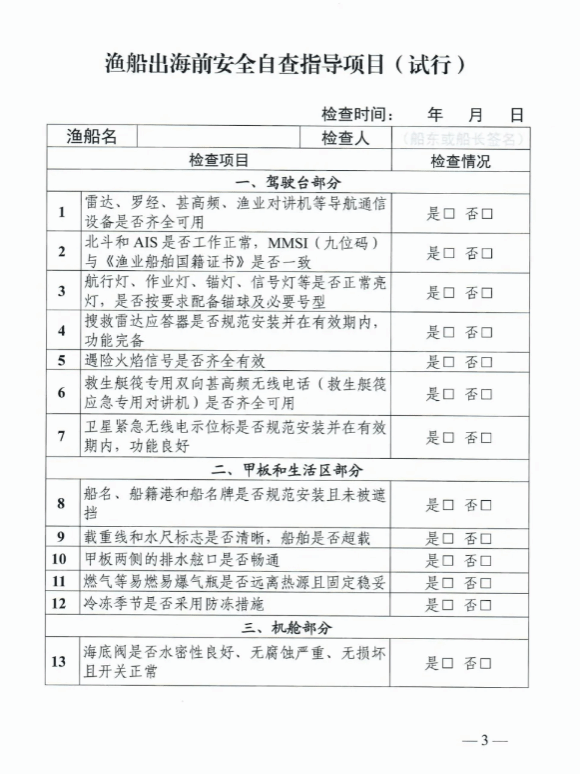 为进一步压实船东船长主体责任,确保渔船出海前安全隐患排查整改到位,按照国务院安委会有关要求,农业农村部渔业渔政管理局会同渔政保障中心研究制定了《渔船出海前安全自查指导项目(试行)》。