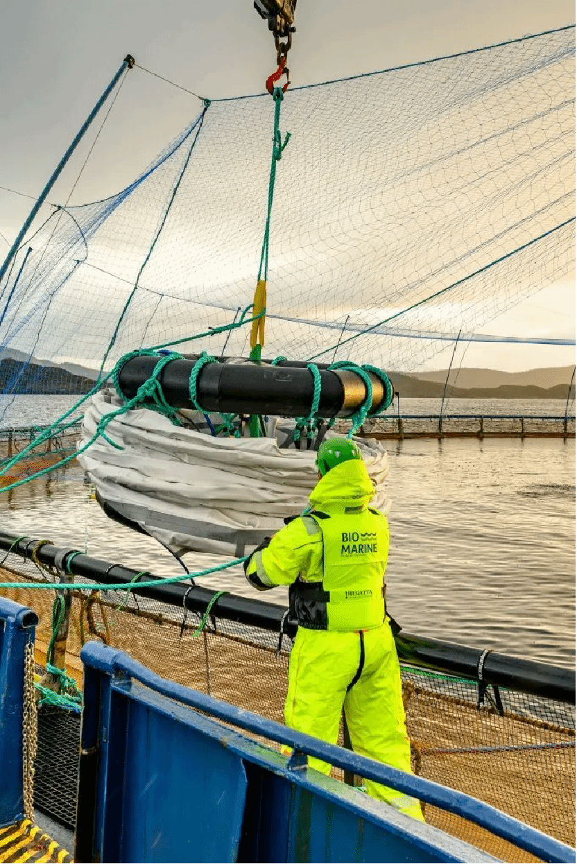 在开放式的海水养殖场,鱼类常面临着海虱、有害藻类和微型水母等微生物的侵袭风险。这些微生物一旦进入养殖网箱,轻则影响鱼的健康,重则带来严重损失,这一直是鱼病防控中的难题。挪威公司Bio Marine研发了一套用于开放网箱的屏蔽系统,通过物理屏障与水体循环装置相结合,有效降低微生物的侵扰。