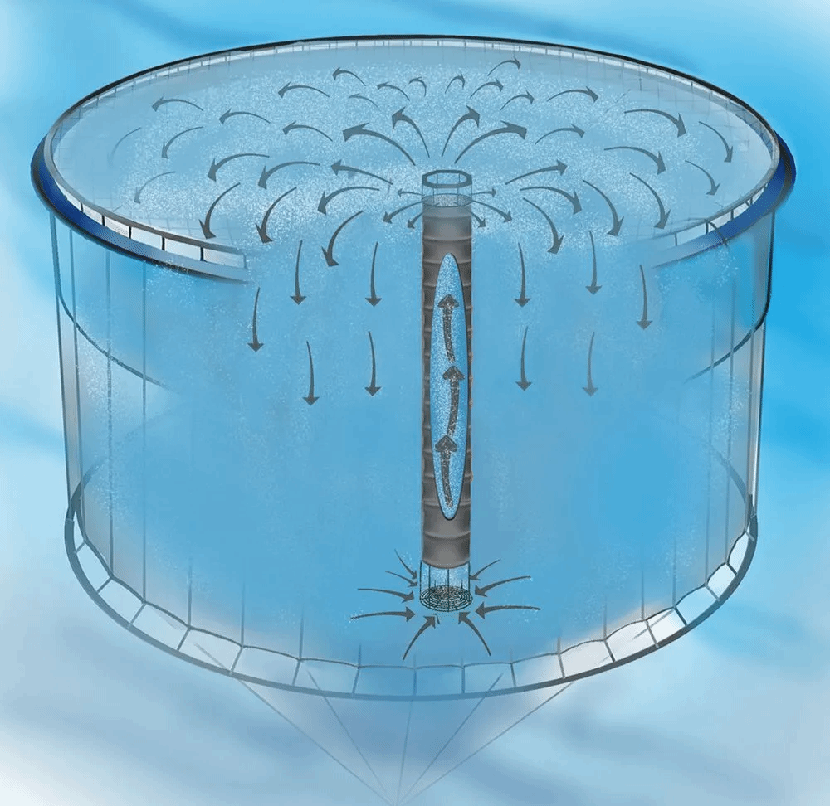 其核心是该公司研发的TurboLift装置,结构类似一个“水下烟囱”,利用压缩空气驱动水体上升,通过“水下烟囱”结构将深层清洁水引入网箱中央,替换原有表层水体,实现持续换水与增氧。这一设计意图在于避免污染物随海流进入网箱,同时使水体不断更新,以降低病原聚集的风险。