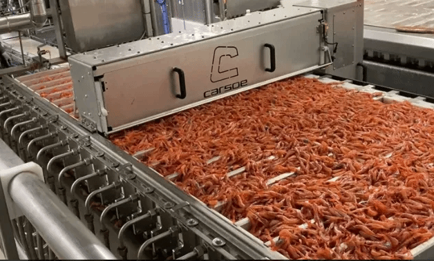 丹麦加工设备制造商Carsoe推出了一款针对虾类立式平板冷冻机的新型附加设备,名为“产品压实机”。该设备可实现虾类压实工序的自动化,旨在提高压缩效率、改善虾块成型效果,同时缓解人工操作压力。