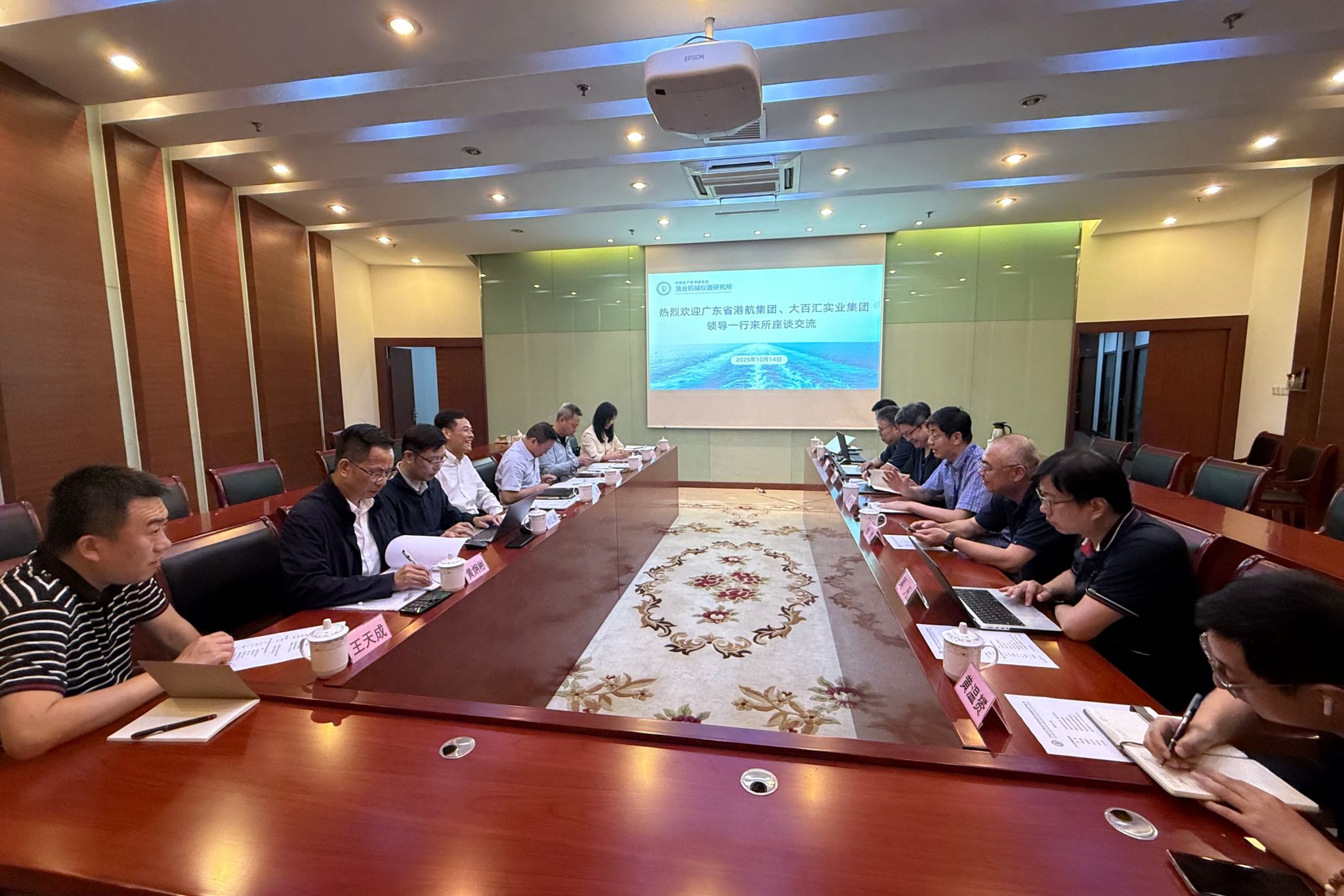 10月14日,广东省港航集团有限公司党委委员、副总经理罗健与大百汇实业集团有限公司副总裁陈胜南等一行到访渔机所。渔机所所长陈军、首席科学家徐皓研究员、深远海养殖装备创新团队负责人崔铭超,以及相关部门负责人等参加了座谈。