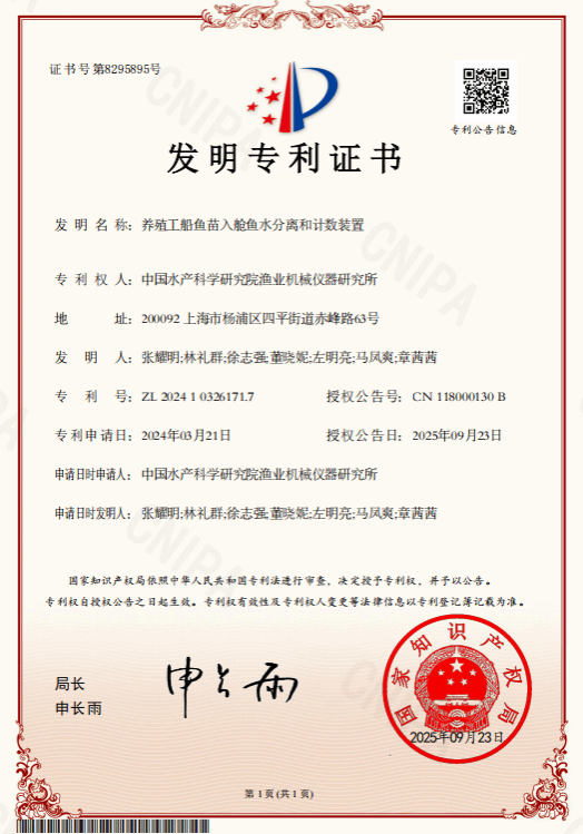 近日,由渔机所张耀明等人发明的“养殖工船鱼苗入舱鱼水分离和计数装置”获中国发明专利授权,专利号:ZL202410326171.7。